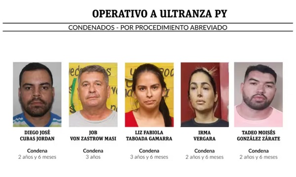 Los cinco condenados en procedimiento abreviado, en febrero último, por la jueza penal de garantías Especializada en Crimen Organizado, Rosarito Montanía. Foto: ABC Color