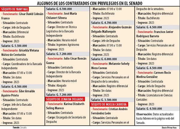 Aquino, electa por Cruzada Nacional pero que pasó al cartismo, tiene 5 contratados a su cargo, la mayoría con cargos de jefatura. Entre ellos se encuentra César David Colmán Franco, jefe de despacho y marcación diferencial, con un salario de G. 5.500.000. Gricelda Viviana Núñez de Centurión, coordinadora de la Bancada Independiente, percibe G. 6.500.000 y Eder Arnaldo Aguirre Prieto, jefe de la bancada Independiente, cobra G. 7.200.000.