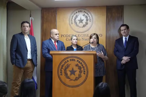 Los senadores Juan Carlos "Nano" Galaverna (ANR, HC), Basilio "Bachi" Núñez (ANR, HC), Lizarella Valiente (ANR, HC), Esperanza Martínez (FG) y Orlando Penner (PPQ), presentaron el proyecto de concesión para la construcción de un canal de 280 kilómetros que transportará agua cruda para el Chaco. Senado Gentileza