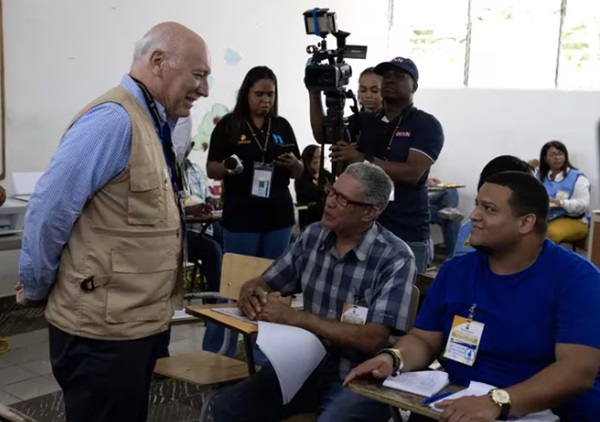 El excanciller paraguayo Eladio Loizaga (exq.), jefe de la misión de observadores de la Organización de Estados Americanos (OEA), visita un centro de votación para municipales en República Dominicana. EFE Orlando Barría