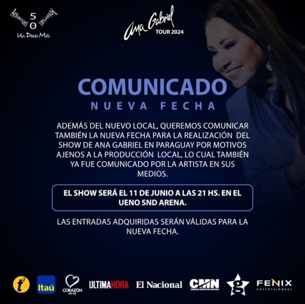 Ana Gabriel reprograma su concierto en Paraguay para el 11 de junio en el Arena SND por razones de salud. Entradas originales siguen válidas.