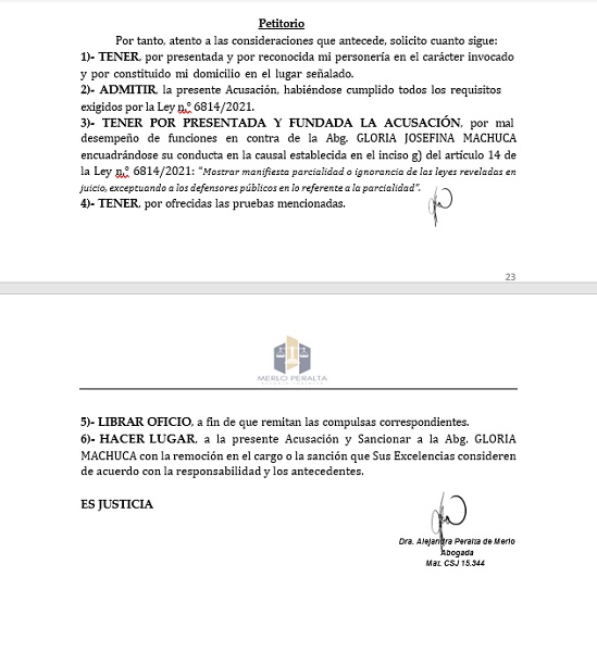 La abogada Peralta Merlo argumenta que esta medida viola el principio “iuria novit curiae”, que obliga a los jueces a conocer y respetar el texto constitucional. La imposición de una censura previa por parte de la magistrada, según la acusación, constituye una causal de remoción de su cargo.