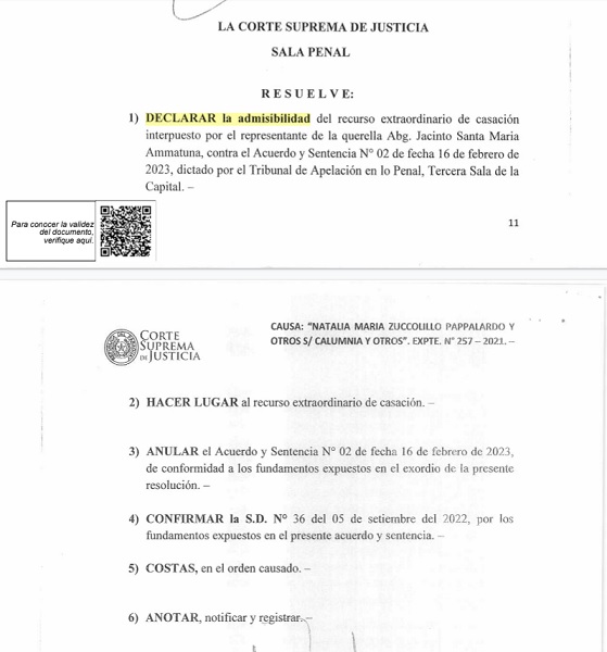 La querella, iniciada por la exministra González, fue rechazada en primera y segunda instancia. La Sala Penal de la Corte Suprema, mediante el Acuerdo y Sentencia N° 211 del 1 de julio de 2024, confirmó la Sentencia Definitiva N° 36 del 5 de septiembre de 2022, dejando firme la absolución. La decisión fue firmada por el ministro Manuel Dejesús Ramírez Candia y los camaristas José Agustín Fernández y Delio Vera Navarro.