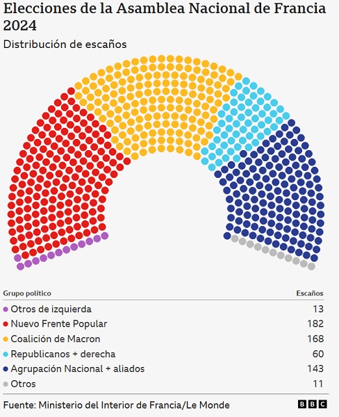 La coalición centrista del presidente Emmanuel Macron ha quedado en segundo lugar con 168 escaños, seguida por la Agrupación Nacional de Marine Le Pen con 143, y otros partidos conservadores con 60 escaños. Esta distribución parlamentaria plantea un escenario político complejo y sin precedentes en la historia reciente de Francia.