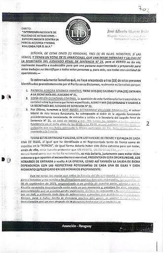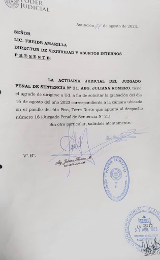 Prosigue la investigación con la intervención de Peritos correspondientes a las áreas de Informáticos y Acústica e Imágenes del Laboratorio Forense del Ministerio Público. La Fiscal Ruth Karina Benítez designa como perito de la causa a Juan Pablo Otazú Sánchez, quien se encargó de examinar las imágenes del circuito cerrado del pasillo de ingreso al Juzgado de Sentencia 21 del Poder Judicial.