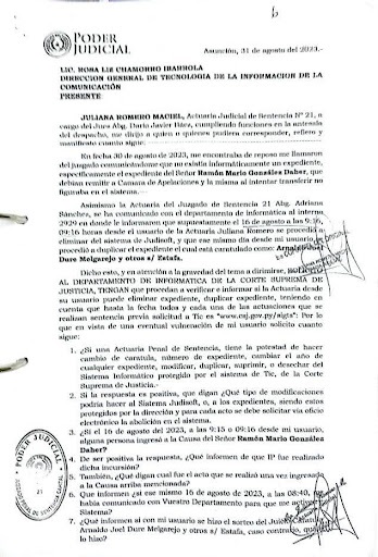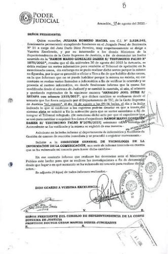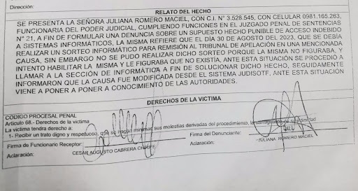 Sin embargo, el 31 de agosto de 2023 la Abog. Juliana Romero Maciel se presentó ante la Unidad Especializada de Delitos Informáticos con el fin de realizar una denuncia sobre el supuesto hecho punible de Acceso Indebido a Sistemas Informáticos ocurrido el 16 de agosto de 2023, sindicando como supuesto autor a persona innominada. Inmediatamente, la Fiscal Silvana Otazú de la Unidad Especializada de Delitos Informáticos comunicó al entonces Juez Penal de Garantías 12, Matías Garcete, el inicio de las investigaciones preliminares en la causa abierta a partir de la denuncia realizada.