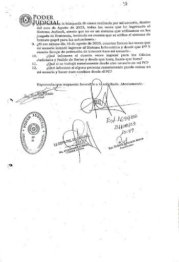 Sin embargo, la Fiscalía hizo caso omiso a lo solicitado, constituyéndose en la Secretaría a cargo de Romero Maciel recién el 26 de setiembre de 2023, veintiséis días después de realizada la denuncia, incautando una sola computadora, que según los informes está supuestamente asignada a la imputada en esta causa. Esta demora en el actuar de la Fiscalía dio tiempo a que varios funcionarios informáticos del Poder Judicial manipularan ese equipo en diversas ocasiones, tal como refieren en sus declaraciones el informático Rodrigo Rodríguez y el propio Juez del Juzgado, Darío Báez.