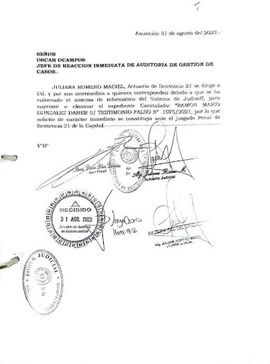 Inicialmente, el Juez Penal de Sentencia 21, Abog. Darío Báez, exjefe de Romero Maciel, dio su visto bueno para la realización de denuncias ante las diferentes dependencias del Poder Judicial: Dirección General de Tecnología de la Información y la Comunicación (TIC); Dirección de Reacción Inmediata de Auditoría de Gestión de Casos; Consejo de Superintendencia de la Corte Suprema de Justicia; y Dirección de Seguridad Interna.