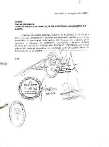 La carátula del expediente de la causa “Ramón Mario González Daher sobre Testimonio Falso”, No. 1075/2021 fue modificada el 16 de agosto de 2023 a las 09:16h desde el usuario “jul_romero”, asignado a la Abog. Juliana Romero Maciel en el marco del desempeño de sus funciones como Actuaria, cambiándose el número de causa, año y carátula, quedando el nombre del expediente como “Arnaldo Joel Duré sobre Estafa” No. 2310/2017.
