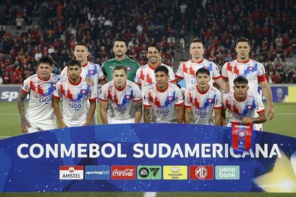 Players of Cerro Porteno pose for a picture before the beginning of the Copa Sudamericana knockout round playoff second leg football match between Brazil's Athletico Paranaense and Paraguay's Cerro Porteno at the Ligga Arena stadium in Curitiba, Brazil, on July 25, 2024. (Photo by Albari Rosa / AFP)