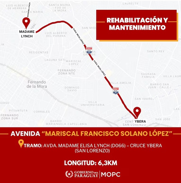 El tramo a intervenir se extiende por 6,3 kilómetros, desde la avenida Madame Lynch hasta el cruce Yberá en San Lorenzo. Esta sección de la Mariscal López, catalogada como ruta departamental D027, es una de las arterias principales de ingreso a Asunción, junto con otras vías importantes como Eusebio Ayala, España, Artigas, San Martín, General Santos y Félix Bogado.