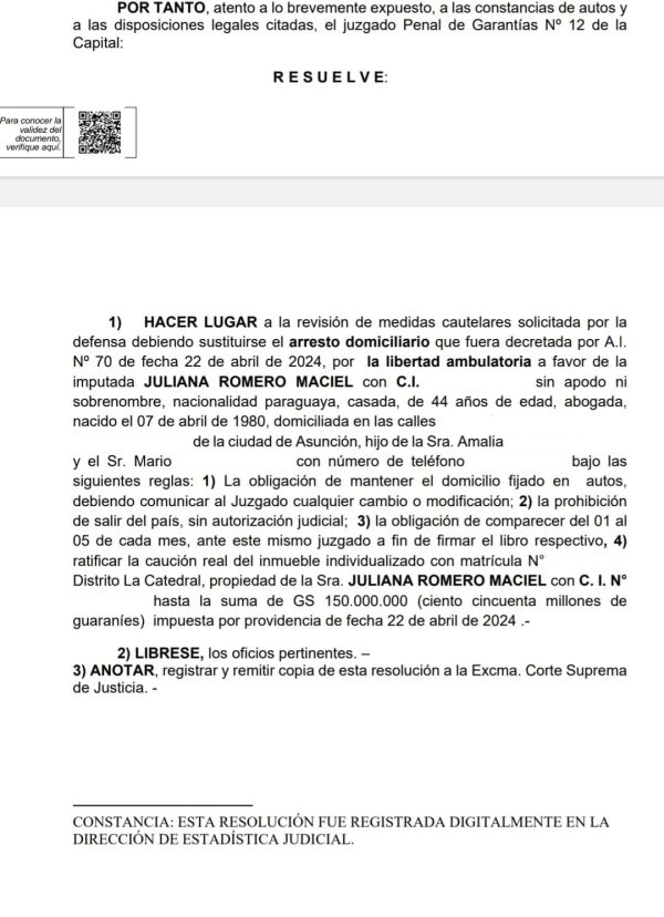 Además, señaló su trayectoria profesional como funcionaria del Poder Judicial con más de 20 años de antigüedad, un inmueble valuado en más de Gs. 500.000.000, un vehículo adquirido por más de Gs. 100.000.000, motivos por los cuales se ajustaba a derecho la aplicación de medidas menos gravosas al arresto domiciliario, sustituyéndolo por la libertad ambulatoria.