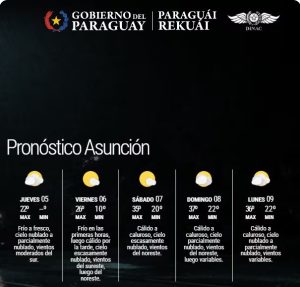 Este jueves, la Dirección de Meteorología pronostica un ambiente fresco en todo el territorio nacional, acompañado de lluvias dispersas en el norte. Los vientos, que soplarán desde el sector sur, contribuirán a una sensación térmica inferior a la temperatura real, que oscilará entre los 20°C y 24°C en la Región Oriental.