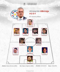 En el mediocampo, Miguel Almirón y Julio Enciso actuarán por las bandas, mientras que Damián Bobadilla, Andrés Cubas y Diego Gómez reforzarán el centro del campo. El esquema principal será un 4-1-4-1, aunque podría variar a un 4-2-3-1 dependiendo del desarrollo del juego.