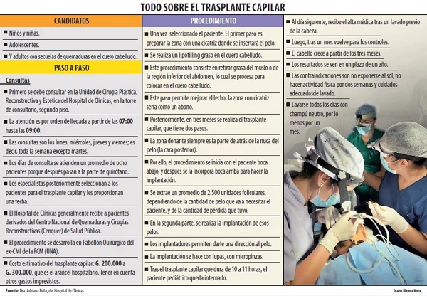 El procedimiento, que dura entre 10 y 11 horas, consiste en extraer aproximadamente 2.500 unidades foliculares y luego implantarlas cuidadosamente, respetando la dirección natural del cabello. El Hospital de Clínicas también realiza trasplantes de cejas para casos similares.