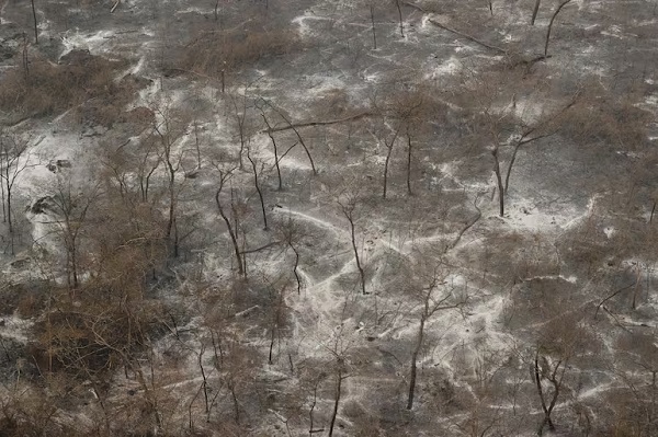 Fotografía aérea de la zona afectada por un incendio en la región del Chaco este viernes, en Bahía Negra. Foto: Juan Pablo Pino