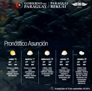 Se informó que la humedad relativa del ambiente será elevada, lo que podría favorecer la aparición de nieblas y neblinas matutinas, especialmente en la Región Oriental. A pesar de esto, la probabilidad de lluvias se mantendrá baja durante toda la jornada.