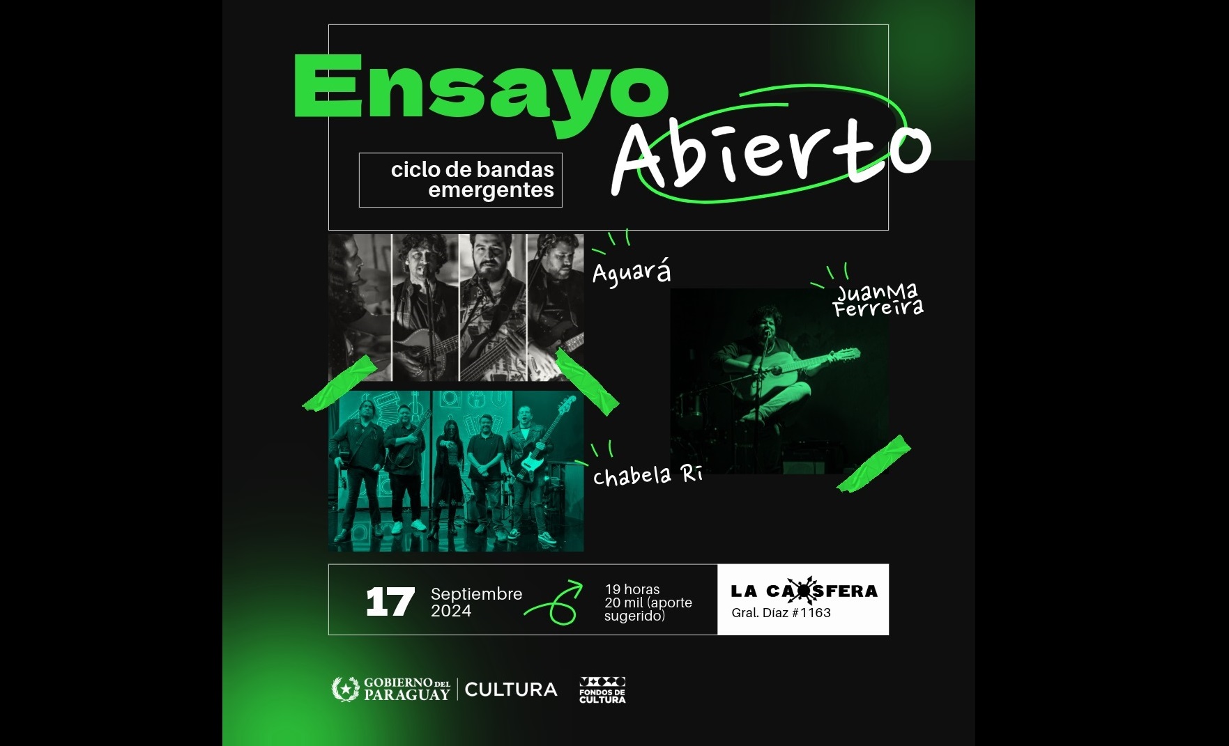 Hoy, martes 17 de septiembre a las 19:00 horas, el ciclo de conciertos “Ensayo Abierto” vuelve a tomar vida en el Centro Cultural La Caósfera, en Asunción. Esta vez, el público podrá disfrutar de la presentación de las bandas Aguará, Chabela Ri y el solista Juanma Ferreira, quienes compartirán su proceso creativo en un formato único que combina música en vivo y ensayo.