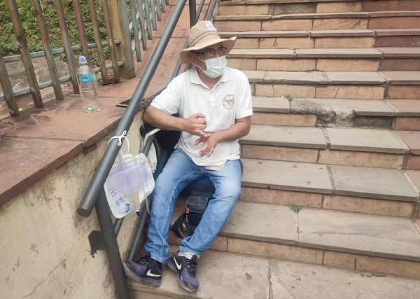 Johnny González, paciente oncológico, se encadenó hoy frente al Ministerio de Salud. Foto: José Heid