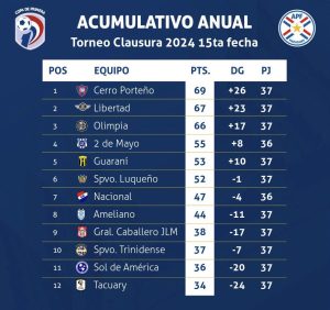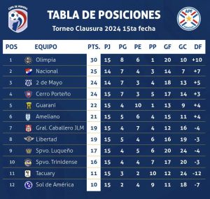La fecha 15 del torneo Clausura 2024 ha arrojado resultados que apretaron aún más la competencia por el título. Cerro Porteño, el Ciclón de Barrio Obrero, logró una remontada clave al vencer 2-1 a General Caballero de Juan León Mallorquín, lo que le permitió acercarse al líder Olimpia, que empató con Sol de América en un duelo disputado en Encarnación. Estos resultados dejan abierta la lucha por el campeonato en las jornadas restantes.