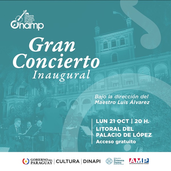 La Orquesta Nacional de Música Popular (ONAMP), bajo la dirección del maestro Luis Álvarez, realizará su esperado “Gran Concierto Inaugural” el próximo lunes 21 de octubre a las 20:00 horas. Este evento cultural tendrá lugar en el Litoral del Palacio de Gobierno y contará con entrada libre y gratuita para el público, con la finalidad de celebrar y proyectar la música tradicional paraguaya. El evento cuenta con 1.000 cupos disponibles, y las inscripciones estarán abiertas hasta el sábado.