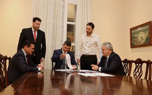 Santiago Peña, Presidente de la República (centro de la foto), firmó los decretos de nombramientos de nuevos funcionarios. ABC Color