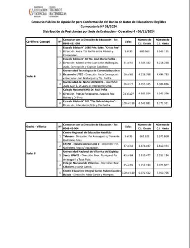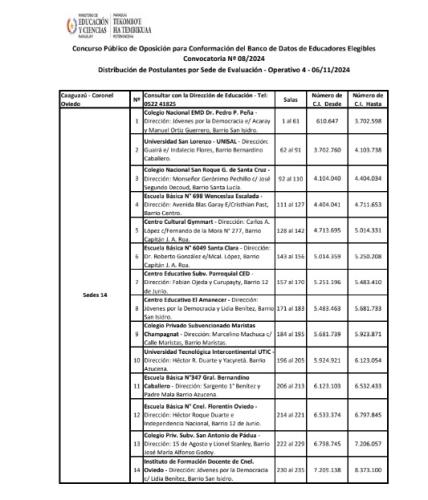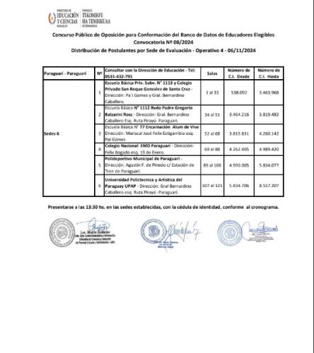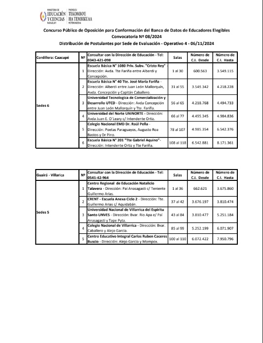 De acuerdo con datos del MEC, el concurso finaliza hoy en cuatro departamentos, con 31 sedes distribuidas en las zonas mencionadas. En Paraguarí y Cordillera se cuentan con seis sedes en cada uno, mientras que Guairá y Caaguazú tienen cinco y catorce sedes respectivamente. Cada postulante ha sido asignado a una sede específica, a la que debe presentarse con su cédula y un bolígrafo negro, requisitos indispensables para la prueba.