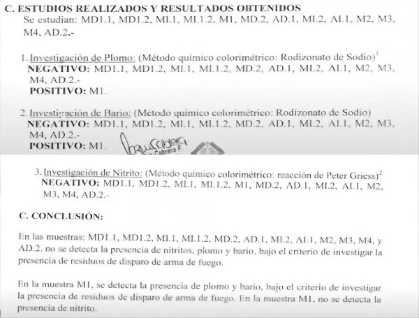 Los exámenes realizados por la Fiscalía incluyeron varias muestras para detectar residuos de disparos en el cuerpo de Gomes. A excepción de una muestra en la zona de la herida en el hemitórax izquierdo, donde se hallaron residuos de plomo y bario correspondientes a la bala recibida, no se encontraron otros rastros de nitrato en las manos ni en el cuerpo de Gomes, descartando así la presencia de residuos de disparos de su parte.