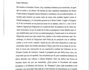 Hamdan Yaseen, ciudadano británico de nacimiento, denunció públicamente haber sido víctima de maltratos y discriminación en la oficina de Migraciones de Ciudad del Este. En una carta dirigida al Ministro del Interior, Enrique Riera, Yaseen afirmó que fue sometido a procedimientos innecesarios y trato discriminatorio al ingresar al país el pasado 18 de noviembre.