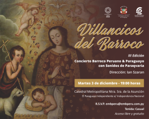 La Catedral Metropolitana de Asunción será el escenario del concierto “Natividad del Señor en el Virreinato del Perú”, organizado por la Embajada del Perú en Paraguay. Este evento, que combina música barroca peruana y paraguaya, se llevará a cabo el martes 3 de diciembre a las 19:00, con entrada libre y gratuita. Estará a cargo del prestigioso conjunto Sonidos de Paraqvaria, bajo la dirección del maestro Ian Szarán.