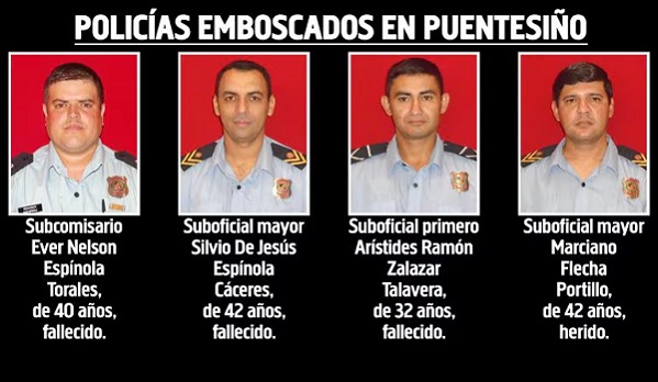 Subcomisario Éver Nelson Espínola Torales, suboficial mayor Silvio Dejesús Espínola Cáceres y suboficial primero Arístides Ramón Zalazar Talavera, asesinados, y suboficial mayor Marciano Flecha Portillo, herido. ABC