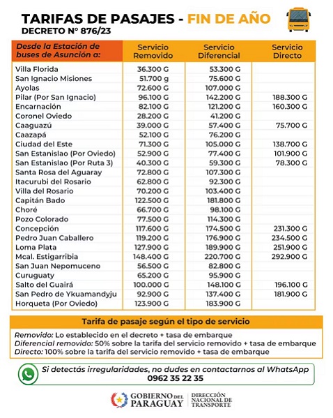 Dinatran recordó a los pasajeros que las tarifas deben permanecer invariables durante estas fechas, respetando lo estipulado en el Decreto Nº 876/2023. Las empresas están obligadas a cobrar los montos actuales y cualquier irregularidad en este sentido puede ser denunciada.
