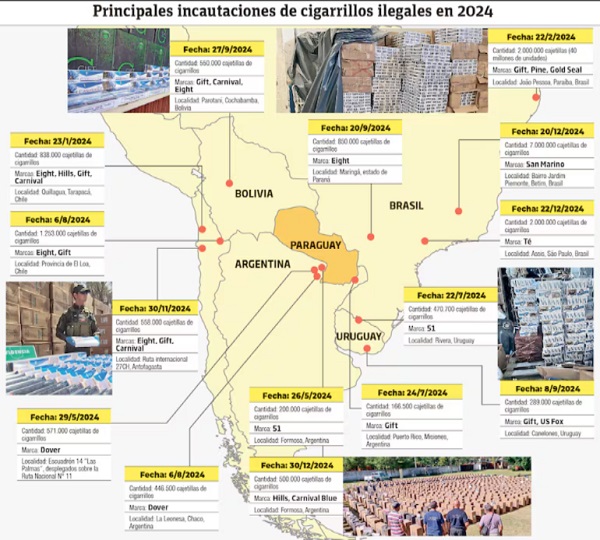 En contraste, las autoridades chilenas intensificaron sus esfuerzos. El Servicio Nacional de Aduanas reportó la incautación de 24,995,293 cajetillas entre enero y noviembre de 2024, evitando una evasión fiscal estimada en 69 millones de dólares.