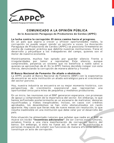 El presidente de la APPC, Enzo Manarinni, reveló que varios productores reportaron solicitudes irregulares de dinero por parte de funcionarios fiscalizadores del BNF durante las inspecciones a granjas. Estos pagos extraoficiales serían condición para obtener el visto bueno en la aprobación de créditos o la ejecución de desembolsos pendientes.