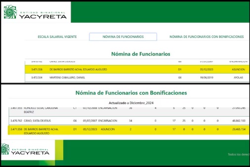 Imagen siguiente Eduardodebarros Planilla de la EBY donde se consigna la categoría salarial y los beneficios de Eduardo de Barros. También aparece en nómina de IPS.