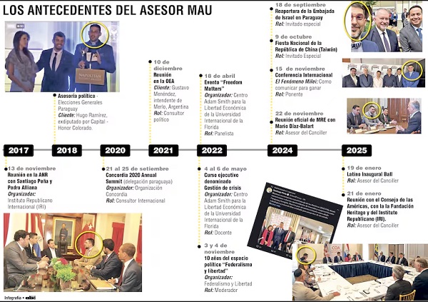 Los antecedentes de Rivas incluyen una reunión con Peña y Pedro Alliana en la ANR en 2017, asesoría política en las elecciones generales de 2018, participación en la delegación paraguaya en la Cumbre Anual de Concordia 2020, y reuniones con figuras como Luis Almagro y Gustavo Menéndez. También ha sido moderador y panelista en eventos de “Federalismo y Libertad” y el Centro Adam Smith para la Libertad Económica.