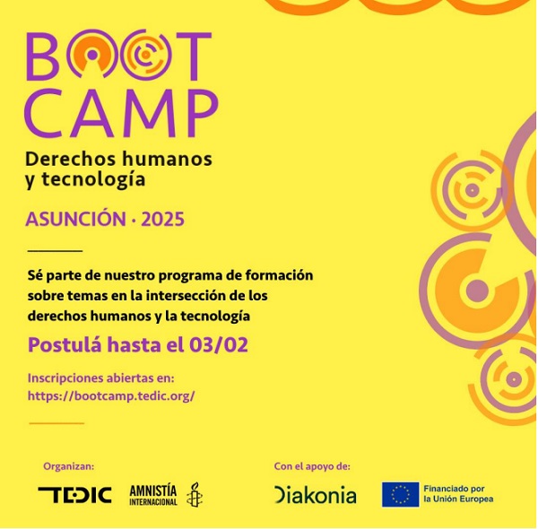 TEDIC y Amnistía Internacional Paraguay presentan el Bootcamp Asunción 2025, un programa especializado en derechos humanos y tecnología, con el respaldo de Diakonia y financiamiento de la Unión Europea. La iniciativa, dirigida a activistas y defensores de derechos humanos residentes en Asunción, se desarrollará del 10 al 19 de febrero en formato virtual.
