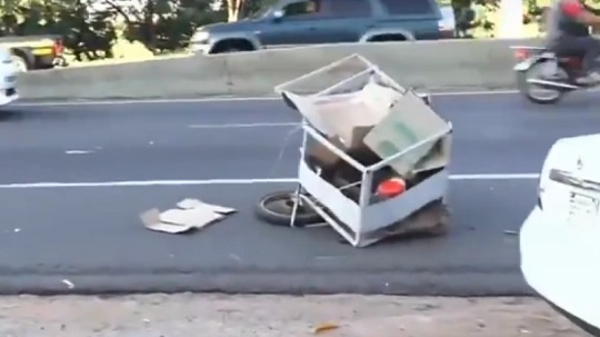 El motociclista, quien abandonó su casco protector en la escena, se dio a la fuga inmediatamente después del impacto. El carrito de metal con dos ruedas, que transportaba botellas de plástico y cartones, quedó disperso a varios metros del lugar del siniestro.