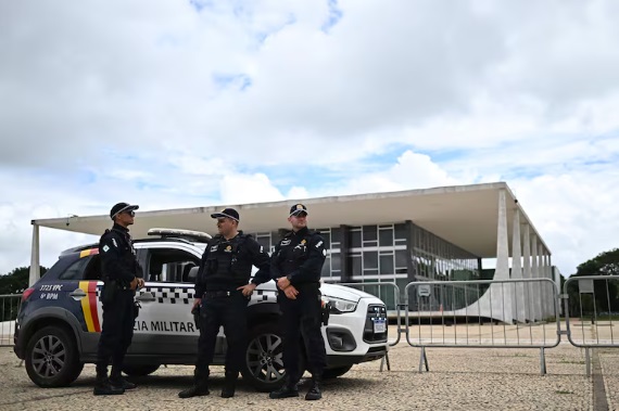 Integrantes de la Policía brasileña haciendo guardia en la sede de la Corte Suprema, en Brasilia (Brasil). La Policía Federal brasileña lanzó este martes una operación para desmantelar un esquema de lavado de dinero de la facción criminal Primer Comando de la Capital (PCC), la mafia más poderosa de Brasil, a través de empresas financieras digitales. EFE/Andre Borges
