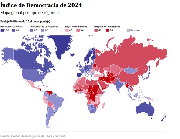 Según revelan los datos, actualmente solo el 45% de la población mundial vive bajo sistemas considerados democráticos, mientras que un 39% permanece bajo regímenes autoritarios y un 15% en sistemas híbridos que combinan elementos democráticos con prácticas autoritarias. De los 167 países evaluados, apenas 25 fueron clasificados como “democracias plenas”, mientras que 46 quedaron en la categoría de “democracias defectuosas”.