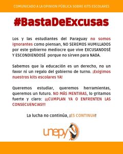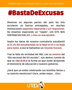 La Unión Nacional de Centros de Estudiantes del Paraguay (UNEPY) emitió un contundente comunicado criticando la gestión del Ministerio de Educación y Ciencias (MEC) tras el denominado “Día de entrega de kits escolares” celebrado el pasado 4 de marzo.