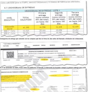 Los registros aduaneros también revelan que el 22 de diciembre de 2024, dos días después de la recepción de ofertas por parte de Itaipú, la misma empresa realizó una segunda importación de 12.425 mesas con estructura metálica y plataforma de MDF, junto con igual número de sillas. Esta cantidad corresponde precisamente a la segunda partida exigida en el cronograma del PBC para el nivel inicial.