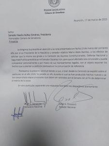 Legisladores de la disidencia colorada y la oposición presentaron este lunes una solicitud formal al presidente del Congreso, Basilio «Bachi» Núñez, para que el exmandatario Mario Abdo Benítez comparezca ante la Comisión de Asuntos Constitucionales antes de que su desafuero sea debatido en el pleno del Senado el próximo miércoles. La iniciativa busca garantizar su derecho a la defensa, permitiéndole exponer sus argumentos antes de la votación.