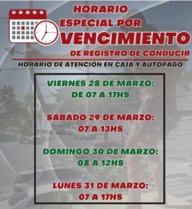 El horario extendido incluye atención por caja y por sistema de autopago. Este viernes 28, el horario es de 07:00 a 17:00. El sábado 29 y domingo 30, la atención será de 07:00 a 12:00. El lunes 31, último día de vigencia del documento, el horario volverá a ser de jornada completa, de 07:00 a 17:00.