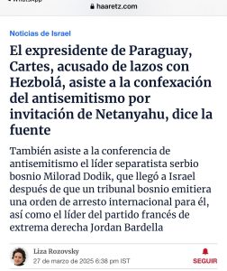El influyente diario Haaretz encabezó su cobertura señalando que “el expresidente paraguayo Cartes, acusado de vínculos con Hezbolá, asiste a una conferencia sobre antisemitismo por invitación de Netanyahu”. El medio subrayó que la invitación provino directamente de la oficina del primer ministro israelí y que el evento también contó con la presencia de otras figuras polémicas, como el líder separatista serbobosnio Milorad Dodik y el político francés de extrema derecha Jordan Bardella.