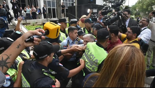 Una indignante escena se vivió este lunes frente al Palacio de Justicia de Asunción cuando efectivos de la Policía Nacional formaron una barrera humana e impidieron mediante empujones y maltratos el paso de manifestantes que realizaban una representación teatral en memoria de Rodrigo Quintana, a ocho años de su asesinato. El acto conmemorativo, organizado por el Partido Liberal Radical Auténtico (PLRA), fue abruptamente interrumpido cuando los participantes intentaron acceder a la explanada judicial para culminar la actividad artística que había comenzado en la sede partidaria.