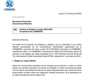 La Confederación Sudamericana de Fútbol (Conmebol) comunicó oficialmente a todas sus asociaciones miembros la implementación de una importante modificación reglamentaria que afecta directamente a los guardametas. A partir de las actuales ediciones de la Copa Libertadores y Copa Sudamericana, los arqueros dispondrán únicamente de 8 segundos para retener el balón en sus manos, una medida que busca dinamizar el juego.