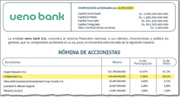 La documentación revela que U Paraguay SA, cuyo principal accionista es la offshore luxemburguesa donde participaba el hermano del presidente, posee el 17,8% de las acciones de ueno bank, equivalente a G. 144.444 millones. Este banco ha captado entre 2024 y 2025 aproximadamente G. 992.000 millones —casi un billón de guaraníes— solamente en Certificados de Depósito de Ahorro (CDA) del Instituto de Previsión Social (IPS), la principal entidad de seguridad social del país. Esta cifra no incluye otros instrumentos financieros como cuentas corrientes u otras inversiones realizadas por la previsional en la misma entidad bancaria, lo que resalta la magnitud de los recursos públicos canalizados hacia esta institución financiera en menos de un año de operaciones.