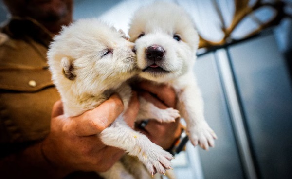 Un investigador sostiene a Rómulo y Remo, dos cachorros de lobo con genes de lobo terrible (Colossal)