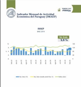 La actividad económica paraguaya inició 2025 con notable dinamismo según refleja el Indicador Mensual de la Actividad Económica (Imaep), que registró una expansión del 4,9% en febrero, acumulando un crecimiento del 5,9% en los dos primeros meses del año.